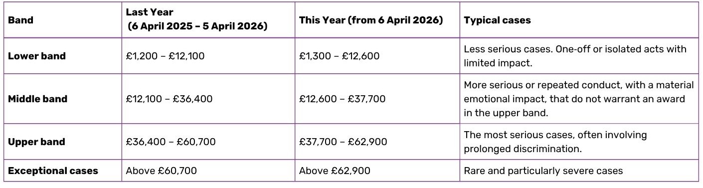 These ‘bands’ guide the ET in deciding on compensation for injury to feelings, most commonly in discrimination claims and whistleblowing claims.